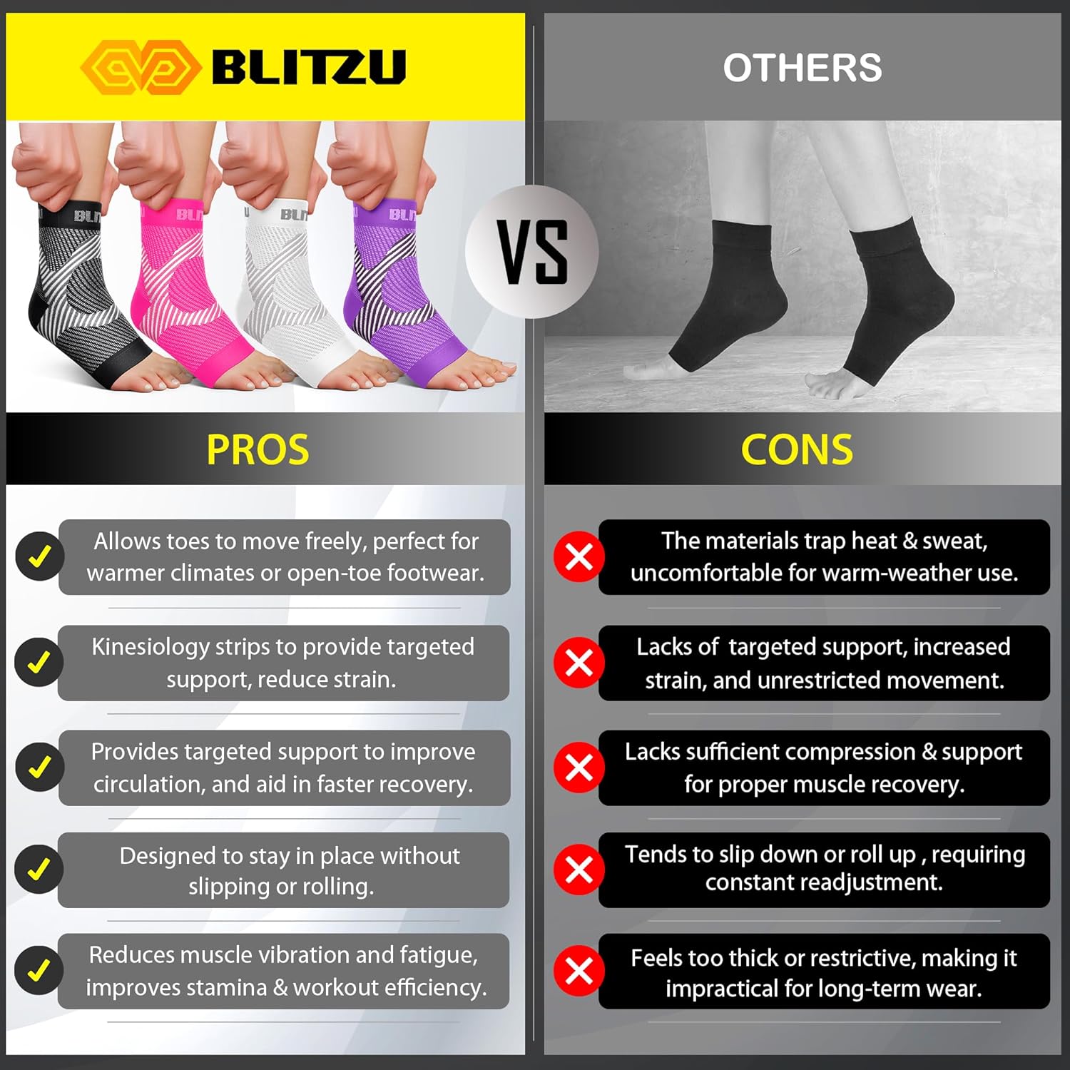 Compared to other plantar fasciitis socks and braces, this 6-pair pack balances affordability and quality without sacrificing comfort or effectiveness. While some premium brands offer more custom sizing or varied colors, these socks stand out for their consistent compression and value. They are ideal for anyone seeking daily relief from heel or arch pain, especially active individuals or those who spend long hours on their feet. Overall, the 6 Pairs Plantar Fasciitis Socks are a reliable, practical choice that we confidently recommend for managing foot pain and improving comfort.